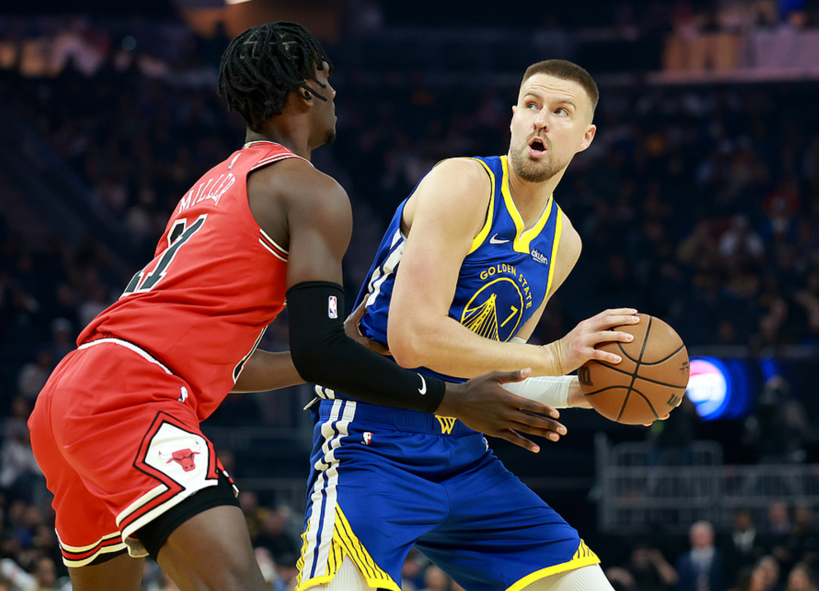 勇士主场迎战公牛,勇士是背靠背作战,昨日他们爆冷输给了爵士,勇士方面库里、巴特勒、梅尔顿、穆迪、小库里缺阵,公牛方面塞克斯顿、艾维、西蒙斯、帕威、科林斯、奥科罗缺阵,两队战力折损都很大。勇士上半场一度领先10分,公牛第二节末段打出一波得分潮反超比分,半场战罢公牛领先6分,第三节双方单节战平,三节战罢公牛领先6分,第四节公牛一度领先12分,勇士追上分差把比赛拖入加时赛,加时赛中公牛技高一筹,最终公牛130-124击败勇士。布泽利斯28中16(三分15中5)得到41分6板2助2断2帽,吉迪16中7(三分9中4)得到21分13板17助、琼斯18中10得到22分4板5助,勇士方面波津13中5得到17分4板2助4帽、霍福德18中5得到13分9板5助4帽、桑托斯19中7(三分9中3)得到17分5板1助。